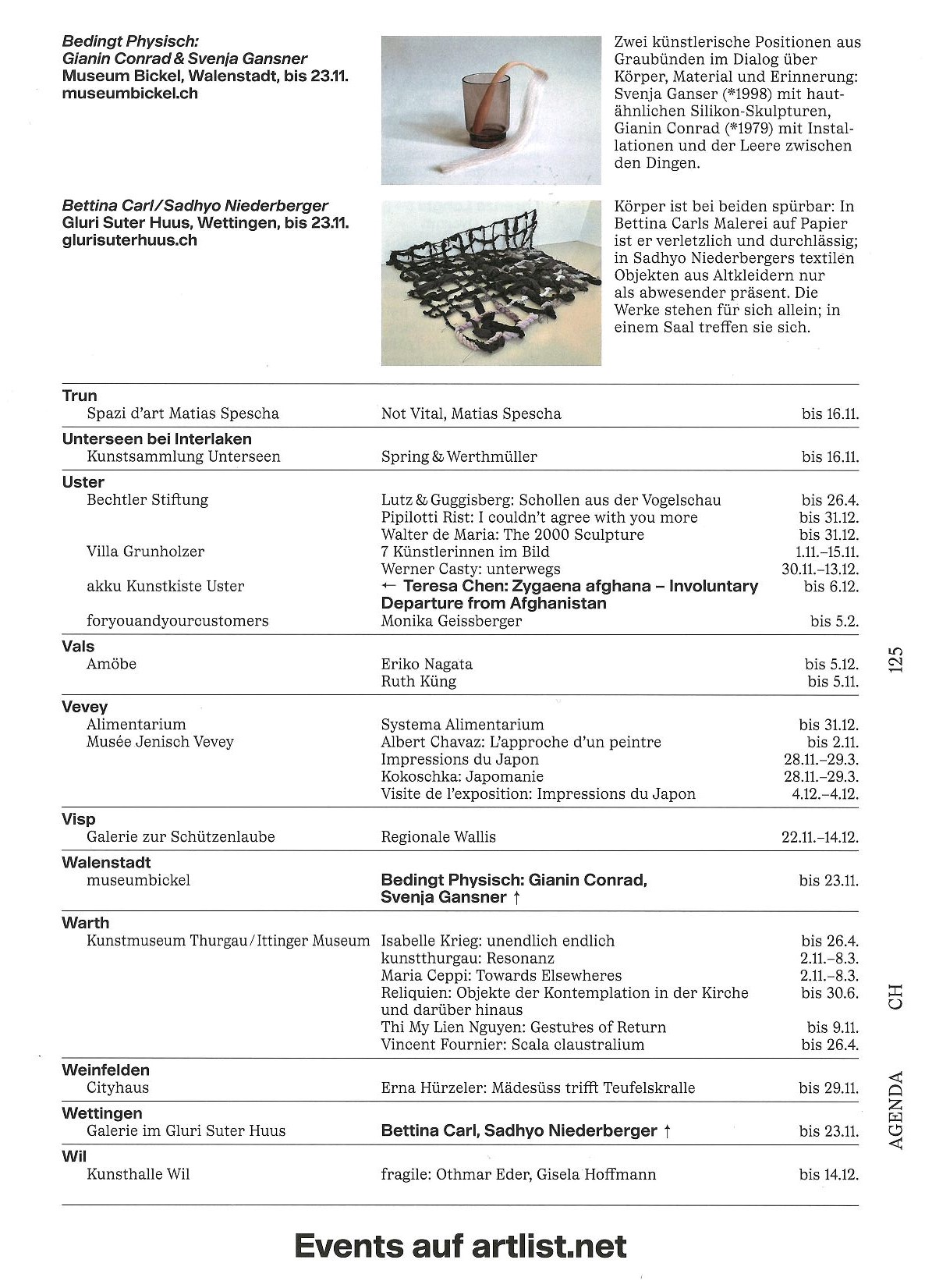 In dieser Ausstellung trifft das Kunstschaffen von Sadhyo Niederberger (*1962, lebt in Aarau) und Bettina Carl (*1968, lebt in Zürich) zum ersten Mal zusammen. Beiden gemeinsam ist eine experimentelle Arbeitsweise, die aus der Praxis des Zeichnens zu stammen scheint, welche die Befragung des „Malgrunds” und der künstlerischen Mittel umfasst und in der Konsequenz dessen eine Erweiterung des Bildes weit über ein Blatt hinaus bewirkt. Ebenfalls gemeinsam ist die stetige Befragung des Menschen, also dessen Körpers, seiner Art sowie der von ihm entwickelten Gesellschaft. Dazu bieten sie keine Antworten, sondern Anregungen und Fragen, die in ihren Kunstwerken versteckt sind.